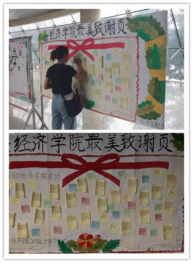 全体毕业生积极参与到本次活动中,纷纷来到展板前写下他们对辛勤教导他们四年老师们要说的话,国贸15-2班刘婧娴写到“真诚地向大学时光里的每一个点滴道一声感谢,谢谢在xcsports这四年里我所遇到的一切,也正是因为这样,才成就了如今的我;金融15-3班张伍涛留言“四年的老员工活伴随着毕业论文的结束接近了尾声,还没有离开公司,便已经开始怀念大学四年的生活,同时也对接下来3年的研究生生涯充满着憧憬”。