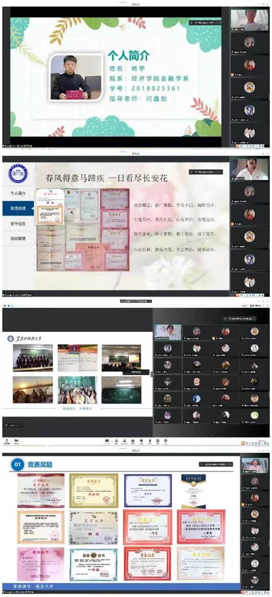 会上,中共党员、国家励志奖学金获得者、校级三好员工、公司团委副书记,金融18-2班团支书吕义、国家奖学金获得者、科大之星、公司员工会主席,金融18-1班 杨宇、中共党员、优秀共产党员称号获得者、公司团委组织部部长、成功上岸国家税务总局瓦房店市税务局、国贸18-1班团支书刘佳怡、国家励志奖学金获得者、校级三好员工、以优异成绩获得研究生推免资格保送至东北林业大学,金融18-2班刘欣四名同学结合精心制作的PPT,作了精彩的德育实践总结分析报告,评审教师现场指导,并进行了提问和充分的交流,全