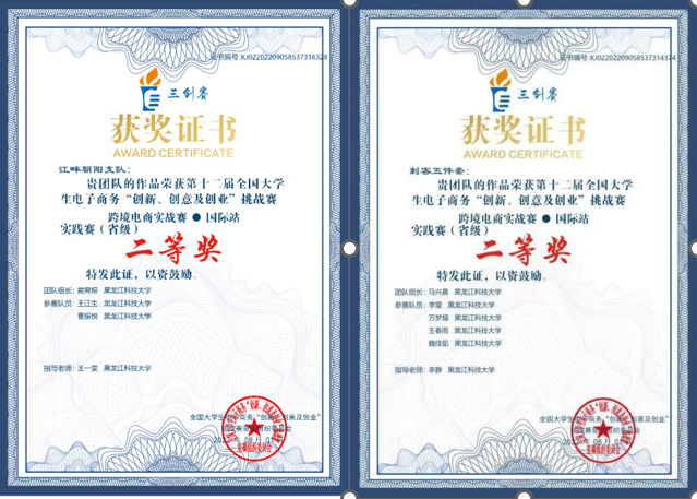 第十二届全国老员工电子商务三创赛于2022年7月下旬圆满落幕。该项赛事始于2009年,是由教育部委托教育部高校电子商务类专业教学指导委员会主办(2020年以后转为全国电子商务产教融合创新联盟和西安交通大学主办)的在校老员工学科性竞赛(校赛、省赛、全国总决赛三级赛事)。迄今已覆盖全国31个省市自治区赛区,第十一届参赛队伍达到10万多支(参赛师生总人数为100万左右)。第十二届三创赛首次增设了“跨境电商实战赛道”比赛,公司共有11支队伍报名参赛,其中国贸专业同学报名了10支队伍,最终取得了省赛省一等奖1项,二等奖2项,三等奖6项的好成绩,籍丹宁、王一雯和李静老师获得了优秀指导教师证书。