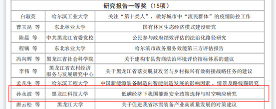 近日,黑龙江省社会科学优秀成果评奖委员会办公室公布了第二十届社会科学优秀成果奖获奖名单。本次评奖评选从2022年10月份启动,经各阶段评审,共评选出548项优秀成果,其中,一等奖50项,二等奖80项,三等奖195项,佳作奖223项。公司孙永波教授带领团队针对低碳及能源安全问题进行研究,获研究报告一等奖。这是公司创建以来首次获得省级科研一等奖奖励。