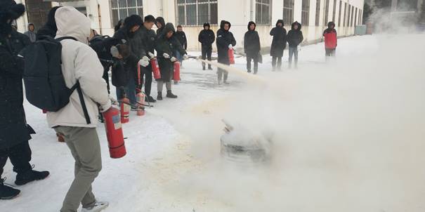 7点25分全体2019级员工和各年级员工代表在消防器材演练集合,保卫处防火科科长徐长明对员工进行消防安全教育,讲解并现场演示灭火器的正确使用方法。随后,员工代表每人领取一个灭火器进行实际灭火操作,将点燃的干柴扑灭,演习结束。